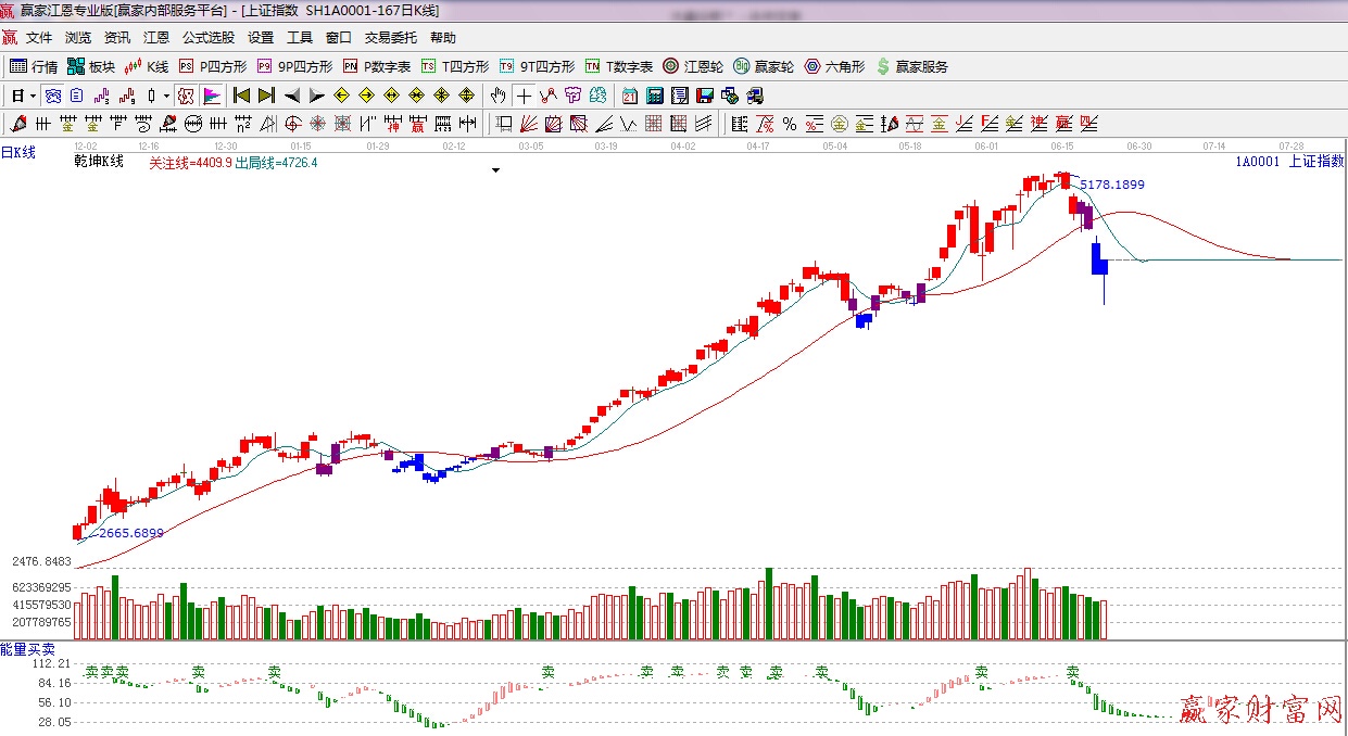 ☆依據贏家江恩理論系統能量買賣提示:綠色能量柱,看空。