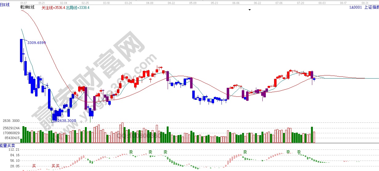 ★依據(jù)贏家江恩理論系統(tǒng)乾坤K線提示:k線有紅轉(zhuǎn)紫警示信號,觀察本周最后兩個交易日關(guān)注線與短期出局線是否會走出死叉,還是粘合。
