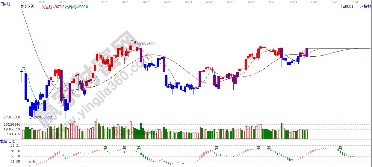 ☆依據贏家江恩理論系統乾坤K線提示:紫色k線警示信號,并收盤站在紅色關注線之上,依據規則,看多。