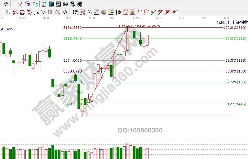 ★依據(jù)贏家江恩理論系統(tǒng)江恩波段百分比線提示:短周期波段百分線,明日短線支撐3115點,阻力位3130點。日線支撐3100點,3076點。