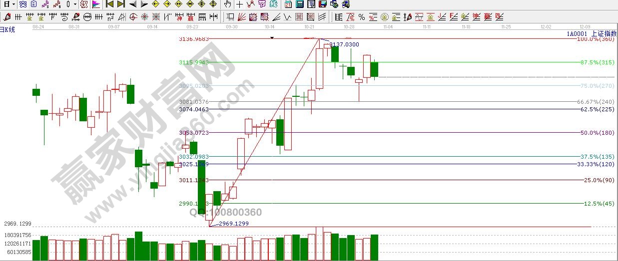 ★依據(jù)贏家江恩理論系統(tǒng)江恩波段百分比線提示:短線支撐270度3095點(diǎn),240度線3081--3074點(diǎn)。阻力位3115點(diǎn)。