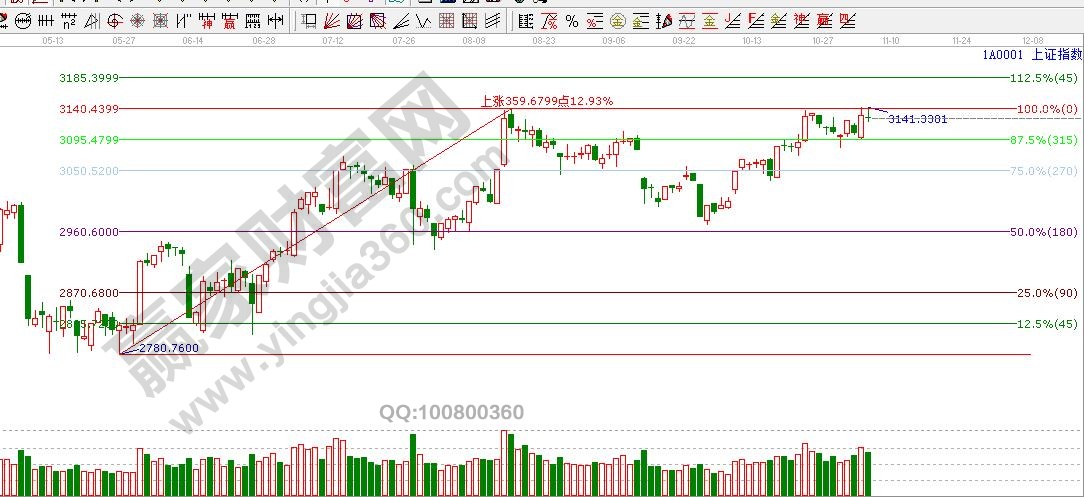 ★依據(jù)贏家江恩理論系統(tǒng)江恩波段百分比線提示:滬指支撐270度3095點(diǎn),盤(pán)中突破3140點(diǎn)新高,此位置一旦收復(fù),下一目標(biāo)位3185點(diǎn)附近。