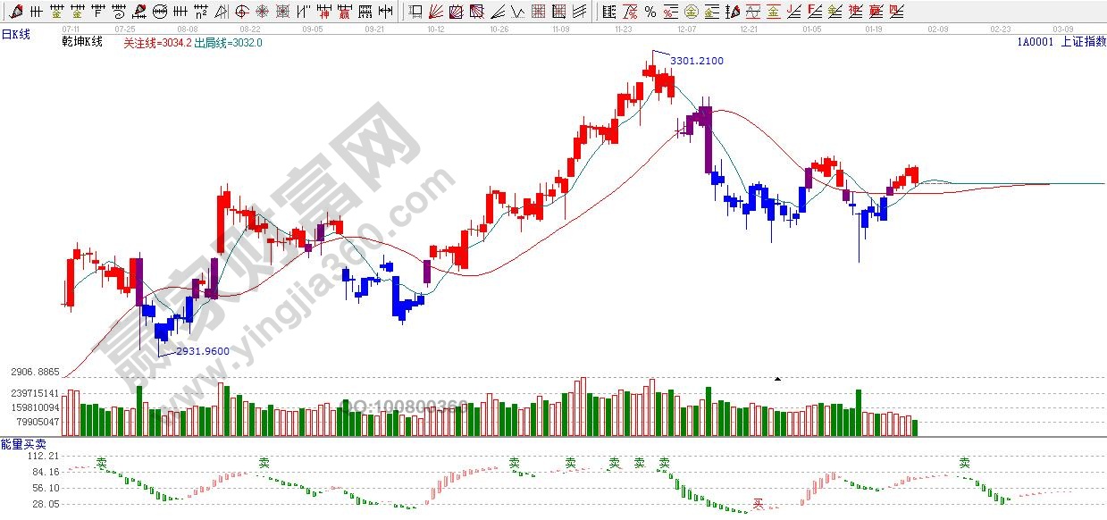 ★依據贏家江恩理論系統乾坤K線提示:滬指k線由紫色警示k線轉入紅色,出局線金叉關注線,依據規則紅色K線看多。