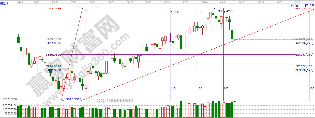 江恩看盤綜述:依據贏家江恩技術工具分析得出:周五,滬指大幅低開,震蕩后繼續跳水,最終在日線生命線3200附近獲得支撐,其實,今日的大跌,除了中鋼協發言引發的周期股大跌外,地緣政治局勢的緊張、外圍市場走低也是主要因素。接下來3200點--3180點附近支撐較強,有短線止跌基礎。短線的急跌往往孕育低吸的機會,時間上8月8日見頂后,下一個需要留意的時間點是8月17或者18日附近。操作上,繼續關注超跌、滯漲且有業績支撐的小盤個股,同時,把握大消費、周期股的結構性機會。
