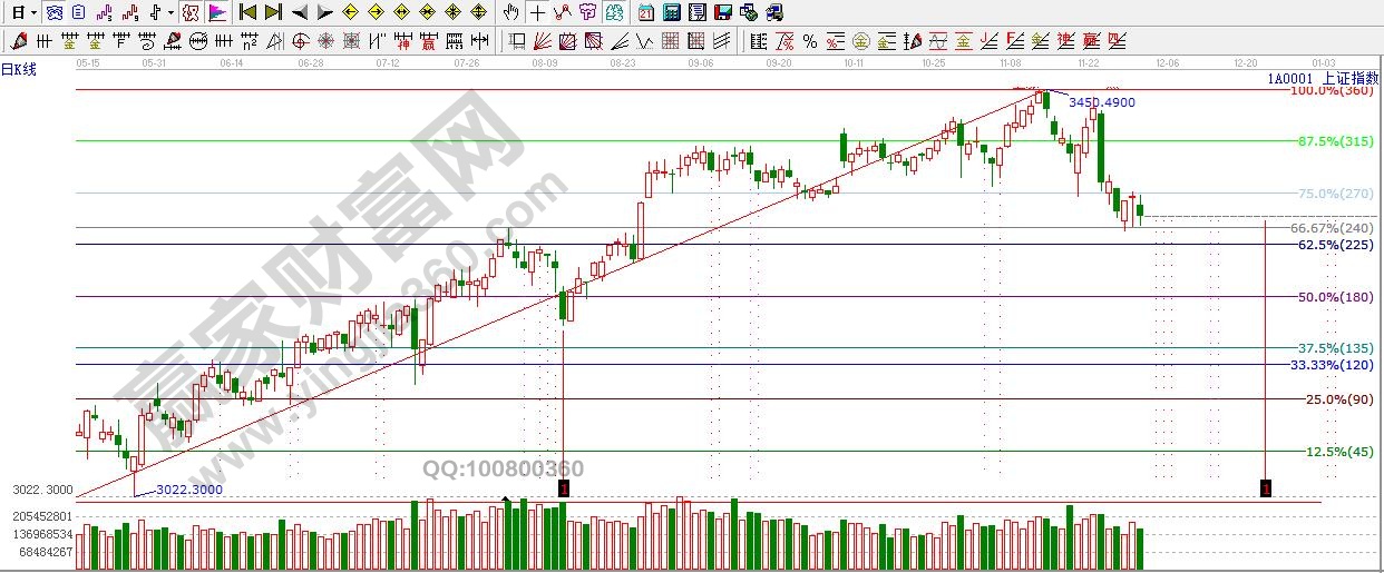 江恩看盤綜述:依據贏家江恩技術工具分析得出:滬指在百分比270度3342點遇阻再次回落,最低探至3306點,尾盤小幅回升。重點關注明天早盤,3306點不破的話,指數還有反彈的機會,如果跌破,3300點也將不復存在。下方225度線在3287點附近。所以,短期此位置或只是輪動性質的反抽行情,全面的反彈還需時日,關注周線時間窗在12月下旬附近。所以,倉位上不宜過重。操作上,建議以超跌反彈的個股交易性機會為主。