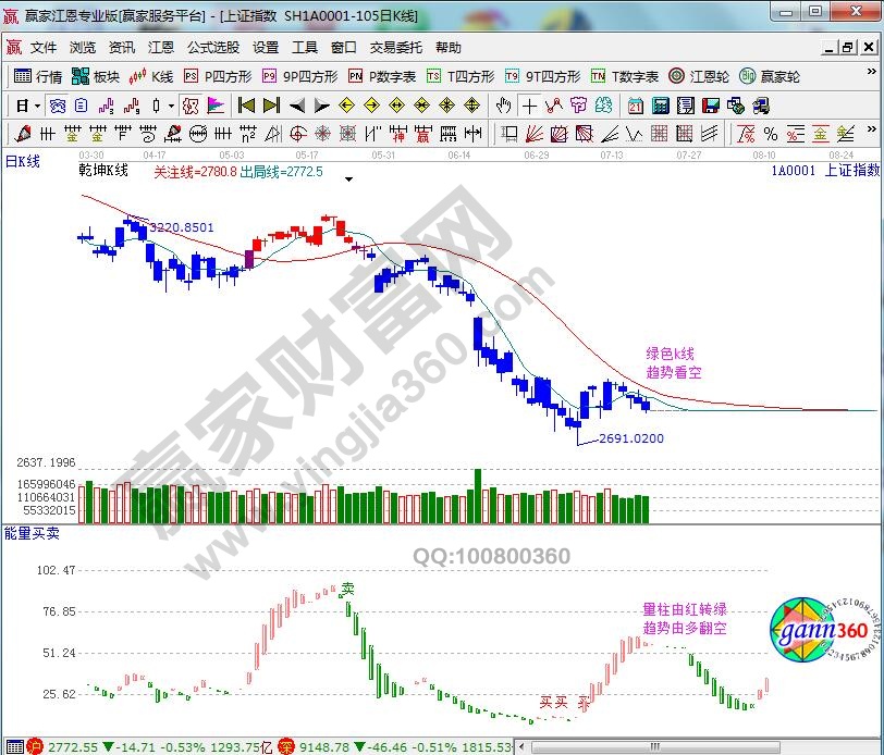 江恩看盤綜述:通過贏家江恩系統(tǒng)趨勢(shì)、時(shí)間、價(jià)格工具綜合評(píng)判市場(chǎng)一星看多(五星評(píng)級(jí)標(biāo)準(zhǔn))。滬指日線依托極反通道藍(lán)線下軌線震蕩,7月6號(hào)最低點(diǎn)2691點(diǎn)對(duì)應(yīng)的是月線藍(lán)色下軌線,周線藍(lán)色下軌線是2640附近,周、月線的下軌線走平,在一定程度上限制了下行的空間;短周期15、30、60分鐘均處于生命線下弱勢(shì)通道,單從K線位置而言,懸空可上可下狀態(tài),20號(hào)早盤11點(diǎn)是日內(nèi)時(shí)間窗,15分鐘生命線是2787點(diǎn),對(duì)應(yīng)藍(lán)色下軌線中2750附近,明日觀察時(shí)間窗與價(jià)格的有關(guān)系,遵循線上支撐線下阻力原則。