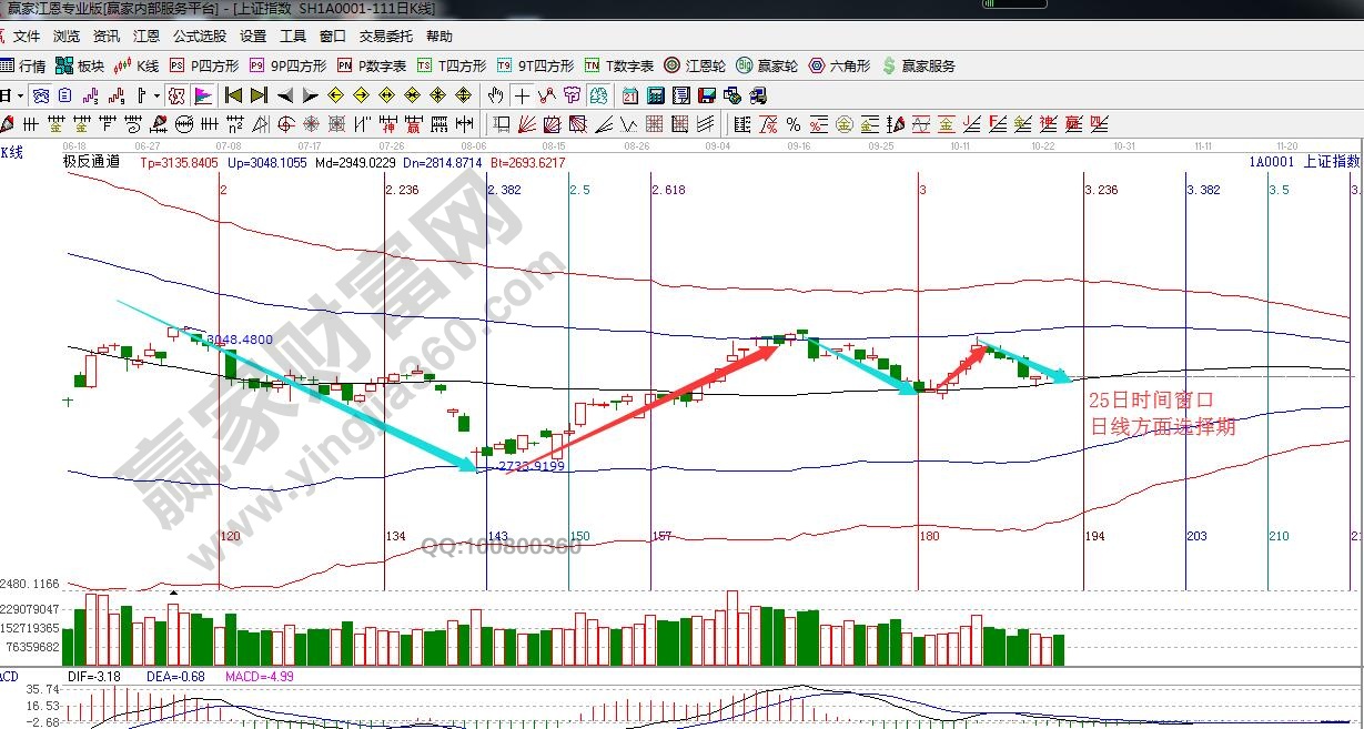 ★依據(jù)贏家江恩理論系統(tǒng)極反通道提示:指數(shù)日K線在黑色生命線2930點(diǎn)上運(yùn)行,按規(guī)則生命線上看多做多。