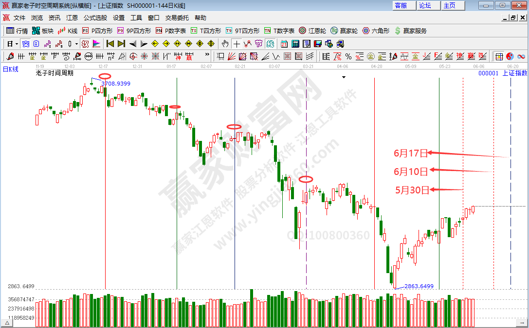 依據(jù)老子時(shí)間數(shù)列所揭示的時(shí)間密碼:滬指未來(lái)次級(jí)別時(shí)間窗口為6月10日、6月17日。