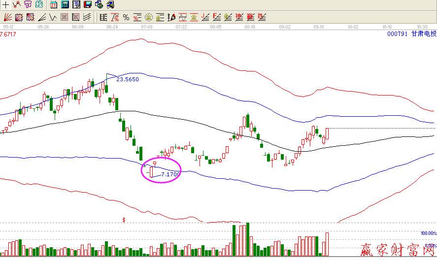極反通道,其原理就是物極必反,即極則必反,全則必缺。000791從高點(diǎn)23.565下跌至極反通道的弱勢(shì)藍(lán)色下軌線(xiàn)位置,已經(jīng)是運(yùn)行到了一個(gè)極致的位置,按照物極必反的原理,這個(gè)位置必定有一波反彈行情,趨勢(shì)上確認(rèn)了未來(lái)的上漲行情,因此在藍(lán)色上軌線(xiàn)位置就是一個(gè)波段建倉(cāng)的位置。