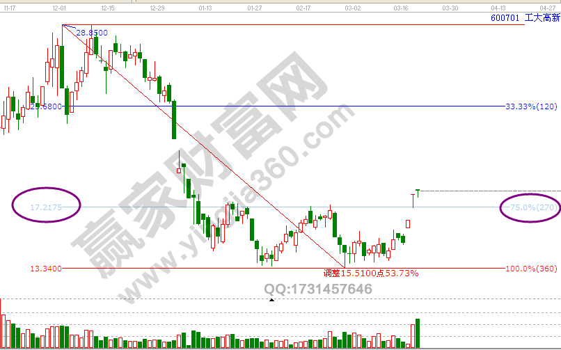 我們再觀察K線圖形,發(fā)現(xiàn)當前的位置也包含在前一波的上漲行情中,即從低點11.40至高點28.85這一波循環(huán)之中,而前面我們將的下跌循環(huán)則包含在了這一上漲的循環(huán)之中,即循環(huán)中的循環(huán)。那么當前的位置和大循環(huán)又有什么樣的關(guān)系呢?我們依然利用百分比來對這個循環(huán)進行分割,我們可以看到,當前位置又剛好是處在大循環(huán)的33.33%的位置17.21獲得支撐。
