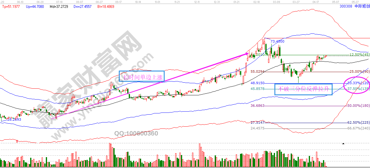以單邊高點之后的下跌為例,在長時間運用中,會發現,在價格百分比中,從高點下調不破位1/3位置,即33.33%-37.5%價格區間就會相對強勢,開始新的一輪上漲反彈,而一旦破位33.3-37.5%價格區間的位置,一般情況下,短線就不具備博弈的價值,而且個股會有相當長時間在弱勢震蕩或是下跌。當然也不是絕對的,有重大消息刺激也不排除出現異類。反之的上漲個行情也可以同理理解。看圖形對比更清晰: