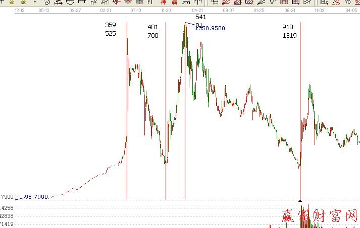 因此,在制定周期時,首先要知道預測的是長線、中線還是短線,然后再按分析的目的尋找各自的起始點。歷史性起點具有影響全局的作用,,長期對市場的趨勢有影響。許多大頂,大底都在其比率中衍生出來。重要性起點,主要起中線分析的作用,支持了大市在某一時期的主要趨勢,且各個重要性起點中間都存在著非常和諧的時間比例關系。而一般明顯性起點多應用在短期行情中,具體的分析方法是用短期市場的各個高低位之間的時間比率關系,來正確地分析和判斷時間的周期。