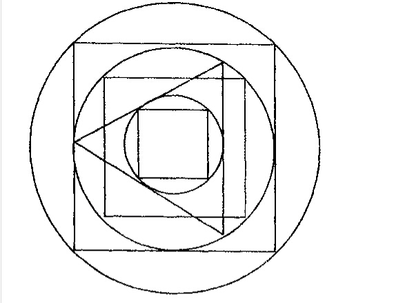 江恩在用圓形做循環(huán)分析時(shí)強(qiáng)調(diào),“圓形的360°——是所有數(shù)字的基礎(chǔ),在一個(gè)圓形內(nèi),可設(shè)置一個(gè)四方形及三角形,但在其內(nèi)又可設(shè)置四方形及圓形,而在其外也一樣可設(shè)置四方形及圓形,上述反映了市場(chǎng)運(yùn)行的4個(gè)面向”,如下圖。