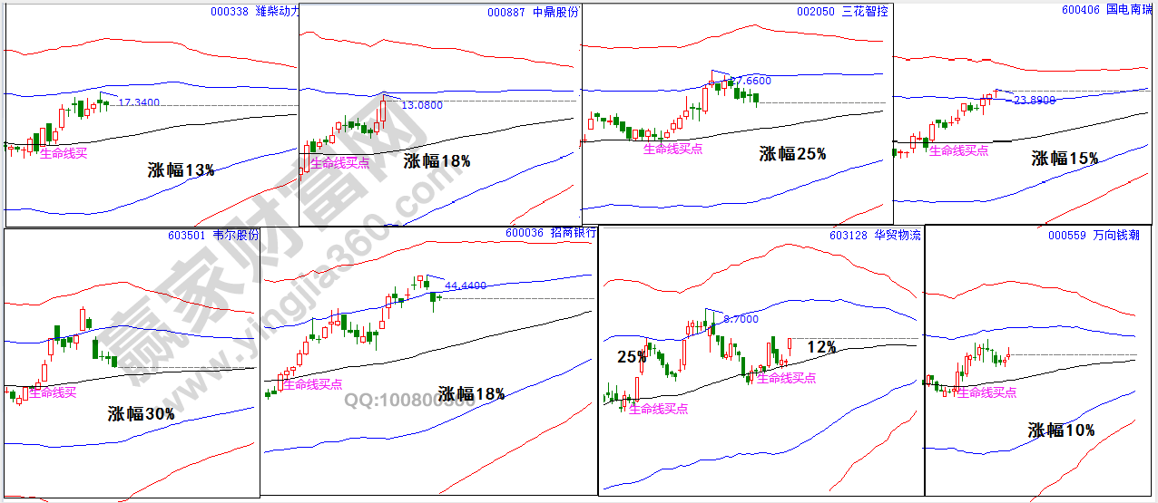 按照規(guī)則,一線站穩(wěn)看高一線,正常情況下,從生命線到藍色上軌線是一波,如果突破上軌線,才會看到紅線,在以上圖形中大家可以看到,很多是一波收益,能直接從生命線到紅色上軌線的股票相對是比較少的,所以在操作中,大家要注意這一點。