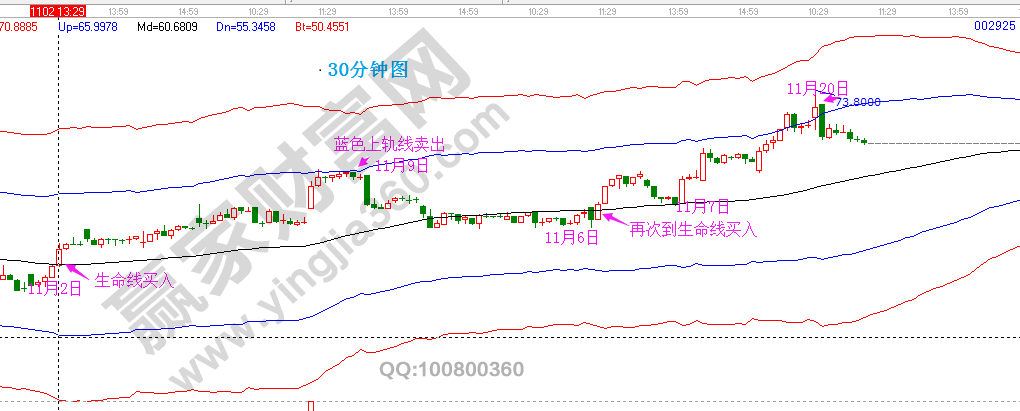 例如盈趣科技,11月2日選出,中間經(jīng)歷了15個交易日才到藍色上軌線這里,中間很多時間都在震蕩,這個時候,可以借助15分鐘或者30分鐘極反通道進行差價操作,如圖所示,短周期的走勢也非常有規(guī)律,可以有效回避因為個股調(diào)整帶來的收益降低,大大提高資金利用率。原本生命線到藍色上軌線的波段空間只有15%,如果加上完美的短周期差價,此波收益將會達到30%以上,一年只要把握3個這樣的機會,就可以實現(xiàn)翻倍收益!生命線到藍色上軌線的股票何其多,擁有了這樣的神器,盈利將不再是任何問題!