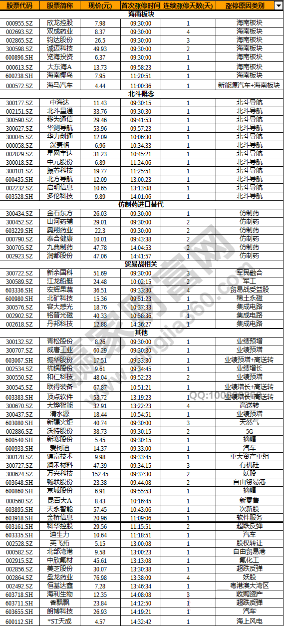 盤面上,北斗地圖APP將于5月1日上線,衛星導航概念股掀起漲停潮,中海達(300177)、華測導航(300627)、移為通信(300590)、北斗星通(002151)和華力創通(300045)等9股漲停。博鰲亞洲論壇2018年年會將于4月8日至11日在海南博鰲舉行,海南板塊大漲,大東海A(000613)、覽海投資(600896)、鈞達股份(002865)、雙成藥業(002693)、海南椰島(600238)、海馬汽車(000572)7股漲停。