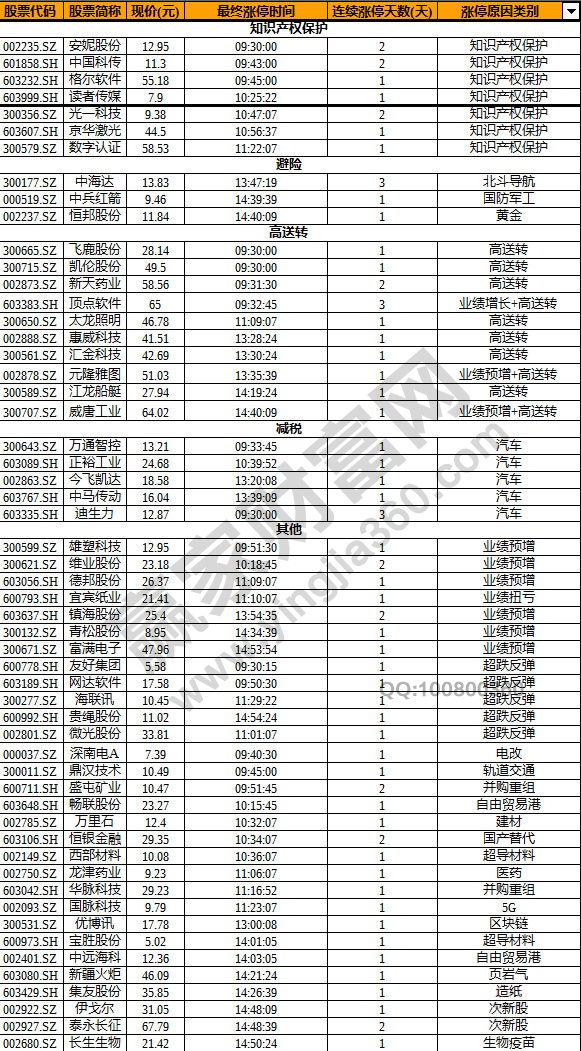 盤面上,知識產權概念股繼續大漲,中國科傳(601858)、安妮股份(002235)、數字認證(300579)、光一科技(300356)漲停。上海自由貿易港大漲,暢聯股份(603648)漲停、上海雅士、上遠海科、上海物貿(600822)大漲6%。超導研究取得百年來新突破,寶勝股份(600973)、西部材料(002149)漲停,百利電氣(600468)、永鼎股份(600105)分別漲6%、5%。原油大幅收漲布油創三年多新高,中曼石油(603619)大漲逾7%,中國石化、中國石油分別大漲3%、1%。臨近尾盤,軍工股直線拉升,中兵紅箭(000519)、亞星錨鏈(601890)雙雙觸及漲停。