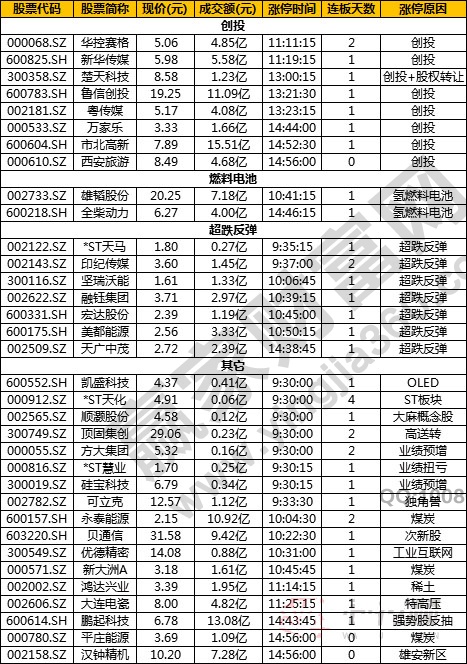 盤面上,創投板塊午后強勢拉升,粵傳媒(002181)、魯信創投(600783)等多股集體封板;煤炭板塊表現強勢,永泰能源(600157)、平莊能源(000780)等多股漲停;漲停股中以低價股居多,多股股價不超過10元。