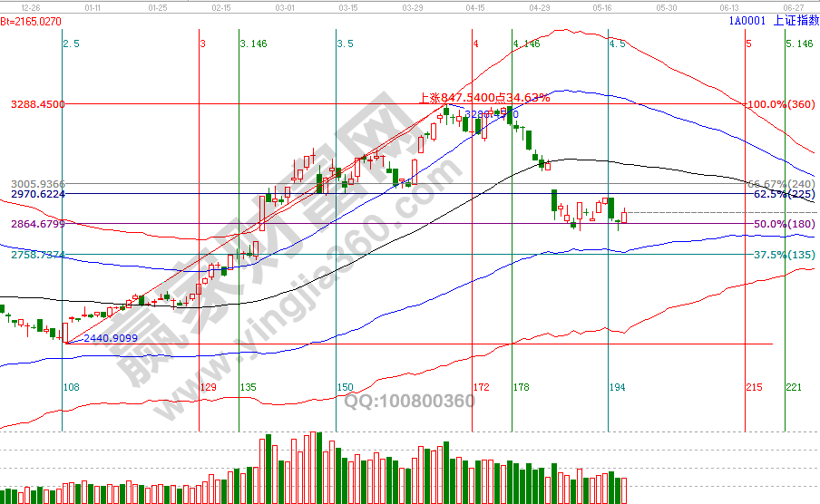 5月10號(hào)、20號(hào),大盤(pán)日K線分別回探波段百分比延伸線1倍循環(huán)二分位2834點(diǎn)后止跌企穩(wěn),第一次反彈止步于短周期60分鐘生命線位置,本次關(guān)注此線能否突破站穩(wěn)(學(xué)員通過(guò)工具查看關(guān)鍵位),站上此線則指數(shù)日k線回補(bǔ)下方缺口的概率將降低(但不排除),23號(hào)短周期時(shí)間后會(huì)再次進(jìn)行評(píng)估。投資者應(yīng)好好把握當(dāng)前機(jī)會(huì),待整固結(jié)束后市場(chǎng)必會(huì)有一波反彈到生命線的機(jī)會(huì)。本周短周期重要時(shí)間窗口是23號(hào),日線時(shí)間窗口是28(29)號(hào)。22號(hào)盤(pán)中壓力是180度2928點(diǎn)、225度2944點(diǎn),盤(pán)中支撐是90度2894。操作策略,指數(shù)擊破黑色生命線進(jìn)入弱勢(shì)區(qū)域,高風(fēng)險(xiǎn)者倉(cāng)3-5成,低風(fēng)險(xiǎn)者本周進(jìn)入備戰(zhàn)期擇機(jī)參與。