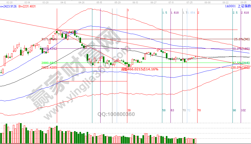 從江恩時間周期角度分析,市場又到了一個日線方向選擇區,回顧近幾個月指數時間窗口(3月7號、4月8號、5月17號、6月5號、27號、7月3、15、23號),市場的重要級別、次要級別的時間拐點都是提前做出測算并公布,今天收盤后贏家江恩技術團隊將借助工具分享8月時間窗口,目前公布的第一個是1號(黃金時間周期0.618);價格方面,江恩價格百分比延伸線2倍零度位2966點與240度2878點,是自8號后強調的具有操作條件的兩個位置,15、23號分別觸及2878點后回升,昨天是上攻至2966點(最高2965相差一個點)回落,結合趨勢,時間、價格三者綜合判斷,本周后半周持有倉的投資者要關注好盤面動向,并做好應對計劃策略,7月31號盤中壓力是270度2961點、315度2978點,盤中支撐是180度2928點、225度2944點。操作策略,指數極反通道生命線震蕩,指數失守60分鐘生命線則反彈信號結束,向上則關注60分鐘藍色上軌線也有望形成反彈結束信號,投資者保持3成。