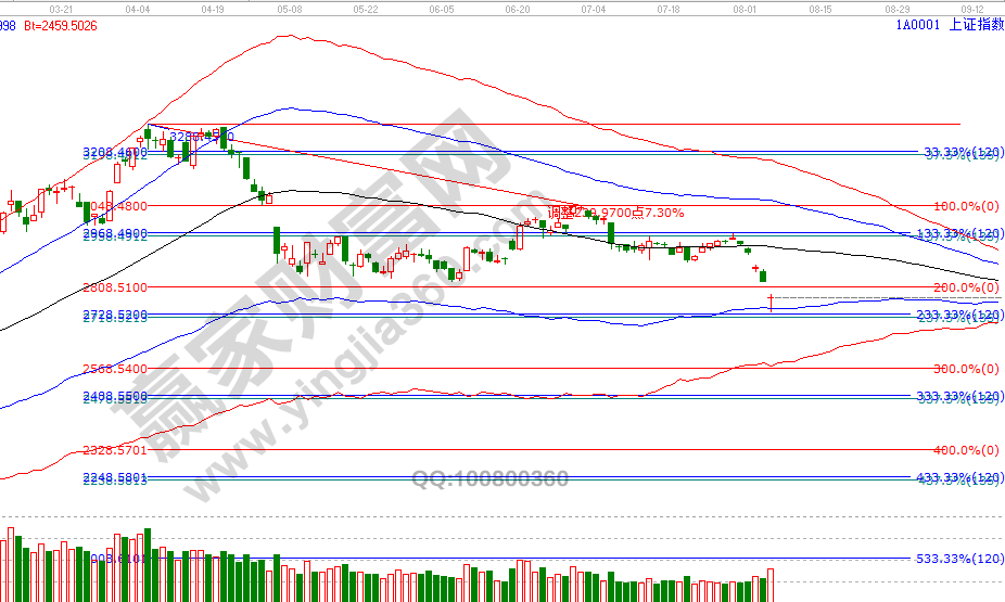 大盤1號失守極反通道生命線,6號觸及藍色下軌線止跌,失守一線看低線,市場再次用行動確認贏家江恩系統規則的實戰有效性,早盤未開盤前在贏家江恩系統學員區發圖,日線藍色下軌線2744點與60分鐘紅色外軌線形成周期共振信號,此位置是激進者短線博弈參考位,按歷史規律日線藍色下軌線會有反復確認的動作,整體此處反抽的空間是波段百分比延伸線180度2834附近。8月7號盤中壓力是120度2791點、180度2800點,盤中支撐是45度2757點、0度2743點時間方面,8號立秋,9號時間窗口,隨后就是16號。操作策略,指數極反通道生命線進入弱勢通道,到達藍色下軌線是目標位,激進者按周期共振信號控制在3成倉交易。