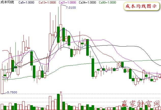 相比較而言,成本平均線比移動(dòng)平均線作為一段時(shí)間內(nèi)市場(chǎng)的平均成本要準(zhǔn)確,其比移動(dòng)平均線更能反映出市場(chǎng)的真實(shí)情況。例如,成本平均線的多頭和空頭排列更加穩(wěn)定,在行情逆轉(zhuǎn)之前出現(xiàn)的假交叉要比移動(dòng)平均線少。而且,成本平均線對(duì)市場(chǎng)運(yùn)行具有明顯的支撐和壓力作用。