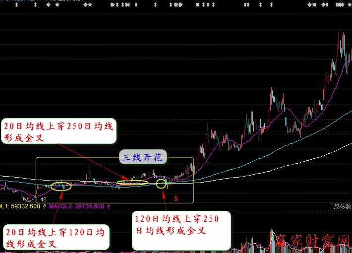 三線開花主要指的是20、120、250這三條均線形成了金叉并各自穿越,像一朵盛開的花兒一樣,這就叫做三線開花。此形態(tài)的出現(xiàn)向我們傳達(dá)著一些重要的信息,因此應(yīng)該引起投資者的重視。除此之外,在三線開花中,120日均線與250日均線距離極其接近,或者120日均線與250日均線處于交叉穿越的狀態(tài)或處于粘連并行的狀態(tài),最后形成極度分離的多頭排列的特殊的技術(shù)形態(tài)。當(dāng)然,三線開花有自己的獨(dú)特特征,那就是此時(shí)20日均線向上穿越120日均線和250日均線的叉點(diǎn)處,因此投資者在判斷三線開花的形態(tài)應(yīng)該認(rèn)真觀察。