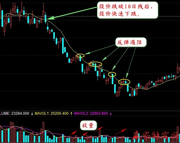 2.在圖中,可以看到股價(jià)出現(xiàn)了迅速下跌,讓很多的投資者都不知所措。但是,隨后出現(xiàn)了持續(xù)放量的現(xiàn)象,股價(jià)又重新出現(xiàn)了上漲的現(xiàn)象,但是仍然無(wú)力突破10日移動(dòng)平均線的壓力,此時(shí)投資者應(yīng)該謹(jǐn)慎操作,否則的話將會(huì)虧損巨大。因?yàn)榇藭r(shí)股市將繼續(xù)下跌,及時(shí)賣出才是最明智的做法。