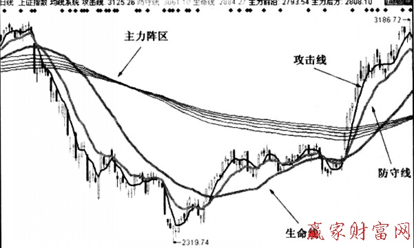 黃金均線"3+1”操盤系統的組成包括三線一區。三線分別是攻擊線、守線、生命線:一區即主力陣區。