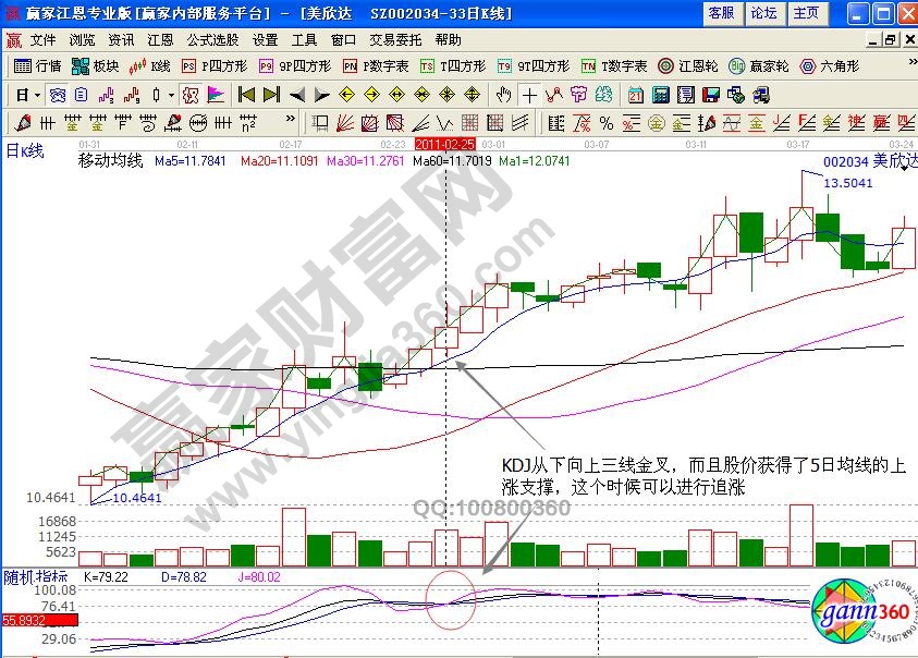 在個(gè)股的案例走勢(shì)分析中,kdj指標(biāo)的金叉和死叉形態(tài),能夠清楚的判斷個(gè)股走勢(shì)中對(duì)應(yīng)的買(mǎi)點(diǎn)和賣點(diǎn)的位置,比如美欣達(dá)(002304)在2011年2月25日的股價(jià)走勢(shì)形態(tài),在對(duì)應(yīng)的KDJ指標(biāo)中形成的就是三線金叉的一個(gè)買(mǎi)入點(diǎn)的位置,其次,就是kdj指標(biāo)的死叉形態(tài)是一個(gè)賣出的信號(hào),在2011年5月2日廣州發(fā)展(600098)的個(gè)股走勢(shì)中表現(xiàn)的很是完美,形成的是高位死叉的賣出信號(hào),投資者應(yīng)該及時(shí)的賣出或者進(jìn)行止損的操作,以規(guī)避后市的損失。