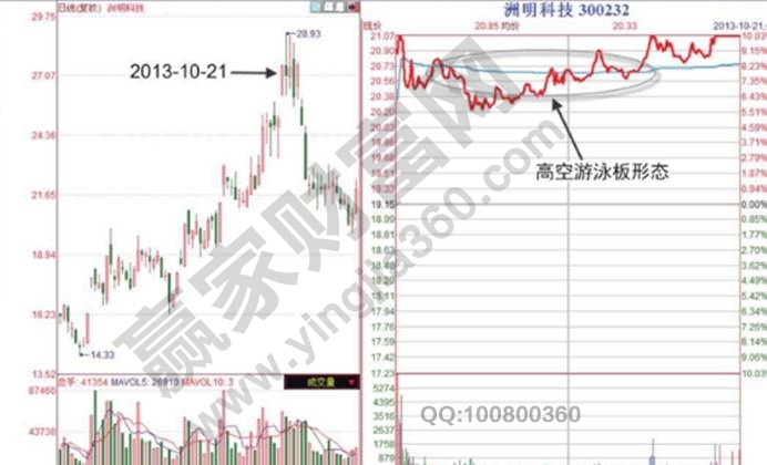 上圖是洲明科技在2013年10月份的走勢圖,從該股在21日的分時圖,我們可以看到,當天該股是高開的,隨后全天都在盤中高點橫向運行,直至尾盤時成功封板。這就是典型的高空游泳板走勢形態,由于個股的中短線漲幅極大,因而這個形態可以看作主力出貨的信號,預示著股票價格走勢將由漲轉跌,應該進行賣出。