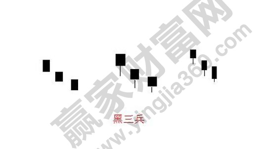 三根中陰線組成黑三兵,陰線的開盤價切入前一天的陰線,上影線以及下影線,短點比較好,如果是高位出現黑三兵,就要小心股價下跌的趨勢。
