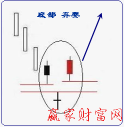 “棄嬰形態”(如下圖)通常是由三根蠟燭線組成,中間一根為十字星線,并且在這根十字星線與其前后兩根蠟燭線之間。從形態上看,它與前后的股價連續發展格格不入,仿佛掉隊的士兵,被遺棄的嬰兒一樣,故此得名。從圖中,我們可以發現股價出現了價格跳空的現象,并且此種形態通常會出現在頂部或者是底部,它是一種發轉信號。由于此形態出現的位置不同,因此可以分為底部“棄嬰形態”以及頂部“棄嬰形態”。通常來說,底部“棄嬰形態”將會預示著股價上升,而頂部底部“棄嬰形態”將會預示股價會下跌。