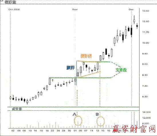 另外,還有一種旗形形態(tài),形成旗形的兩天直線并非平行的,而是像相同方向移動并逐漸靠攏,在較短的時(shí)間內(nèi)形成一個(gè)扁長的三角形,我們將這樣的旗形形態(tài)稱之為楔形旗。楔形旗一般出現(xiàn)在市場運(yùn)行趨勢的中心位置,即可以是上升趨勢中,也可以是下跌趨勢中。而成交量在大多數(shù)時(shí)間則會伴隨著楔形旗形態(tài)逐漸減少。當(dāng)楔形旗結(jié)束行情突破后,成交量有會顯著放大。