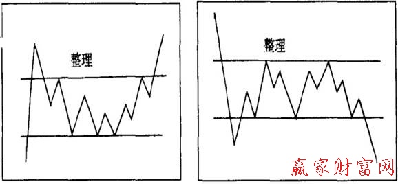 多頭市場里,上升行情亦會發生回檔整理,并且經過換手而使股價脫離盤局繼續上漲??疹^市場則反之,下跌行情出現反彈,無力上升時,股價突破盤局下端又跌一段。也就是說,股價行進方向未受短暫的干擾而改變其持續性,最后,原來掌握優勢的一方重新居于上風。中間停留的盤檔走勢稱之為整理(如下圖)。