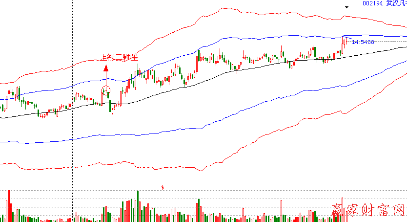 上漲二顆星的出現表明漲勢仍會繼續,股價很有可能在短期內展開新一輪的升勢。因此,投資者見此K線組合后可適量增加倉位,持股待漲。