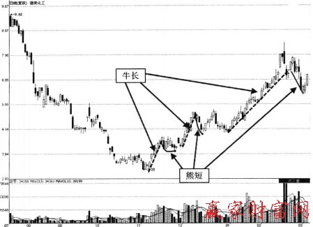 牛長熊短形態多出現在主力的建倉階段,是主力資金持續吸籌的一種表現形式。當然,在分析牛長熊短形態是否確切地反映了主力建倉這一市場含義時,我們還應結合價格的總體走勢分析,只有出現在低位區的牛長熊短形態且伴以量能的放大,才是較為可靠的主力資金建倉信號;而對于那些出現在明顯高位區的牛長熊短形態,我們只可將其理解為主力資金暫時并沒有明顯的出貨行為。