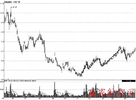 圖2為中電廣通(600764)2008年5月12日至2009年3月20日期間走勢圖,如圖標注所示,此股在持續下跌后的低位區出現了牛長熊短的走勢,與這一走勢一同出現的就是成交量的溫和放大,這正是場外買盤資金源源不斷流入的跡象,預示著趨勢的反轉,是我們進行中長線布局的時機。