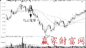 烏云籠革是兩根K線的組合形態。其中第1根K線是陽線,第2根K線是大陰線,表示趨勢反轉已經發生,隨后將可能出現較長時間的下跌。一般陰線實體的收盤價下穿入人前一個陽線實體的程度越深,該形態構成市場頂部的機會就越大。烏云籠翠形態如圖所示。