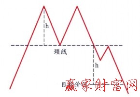 3.雙重頂形態可以通過測算雙重頂的高度確定目標價位。由于雙重頂的兩個頂基本處于同一水平,測算出頂點到頸線的垂直距離h;同時,以突破點為起點,向下投射等同h的距離,就是雙重頂的目標價位,如圖1所示。