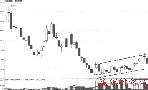圖為國陽新能(600538) 2008年1月至2009年2月期間周K線走勢圖,此股在大幅下跌后進入低位區,此時,周K線開始出現連續的中小陽線及偶然性的大陽線,同期的價格走勢也呈現出了企穩回升的態勢,這是個股進入底部區的標志。