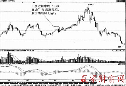 觀察上面兩圖,在上漲途中出現(xiàn)了看漲三線直擊后,股價(jià)經(jīng)過短替的調(diào)整繼續(xù)向上運(yùn)行,因此看漲三線直擊中的最后一根大陰線只不過是主力在拉升股價(jià)過程中的是一次洗盤,這種洗盤行為井不會(huì)改變股價(jià)原有的運(yùn)行趨勢(shì)。