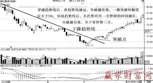 當股價經過長時間的下跌后,沿著各個逐步步移的高點劃出一條下降趨勢線,股價如能放雖突破下降趨勢線漲升,為買進信號。下降趨勢線形成的時間越長,準確率越高。突破成交量如能持續放大,后市走勢將更理想。如圖所示。