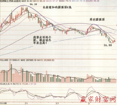 下圖為包鋼稀土(600111),該股自56.60元大底部一路上漲,當股價拉到96.30元,盤中獲利盤豐厚,拋壓加大時,聰明的主力使用了非常巧妙的圓弧頂K線趨勢來完成籌碼轉移和兌現,如圖所示。