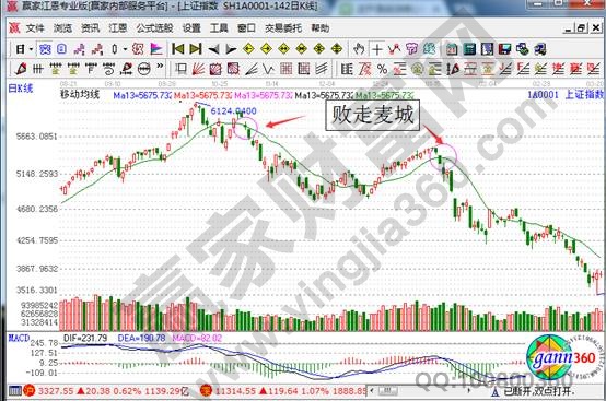 股票敗走麥城其實是一個陷入絕境的走勢,也是一種短期行情結束的標志,具體它的走勢是怎么樣的?它具體指的就是股價跌破13日線的中陰線。它的出現意味著一個階段的失敗,但不是全局的失敗,這也是需要注意風險來臨的階段。接下來我們就來看上證指數的走勢圖。