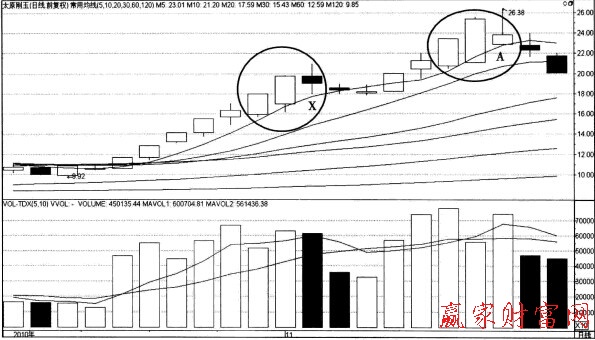 第一次見頂之后,之所以還可以出現一波強勁的上揚行情,從見頂之后幾天的走勢中,是可以看出一些端倪的。在X點的高點那天,是收出了一根跌幅為3.7%的十字星,之后兩天,又收出了跌幅分別為3.4%和1%的十字星,跌幅明顯收窄,X點的次日,量能就大幅萎縮,調整的形態較為理想。