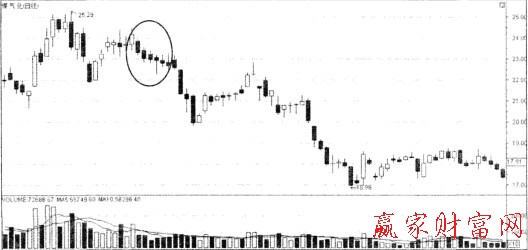 一般而言,在高位盤整中突然出現連續五陰線,此為行情看壞的明證。在上端連出五陰線,表示空頭固守陣線不退讓,隨后多頭可能將拋售了結。
