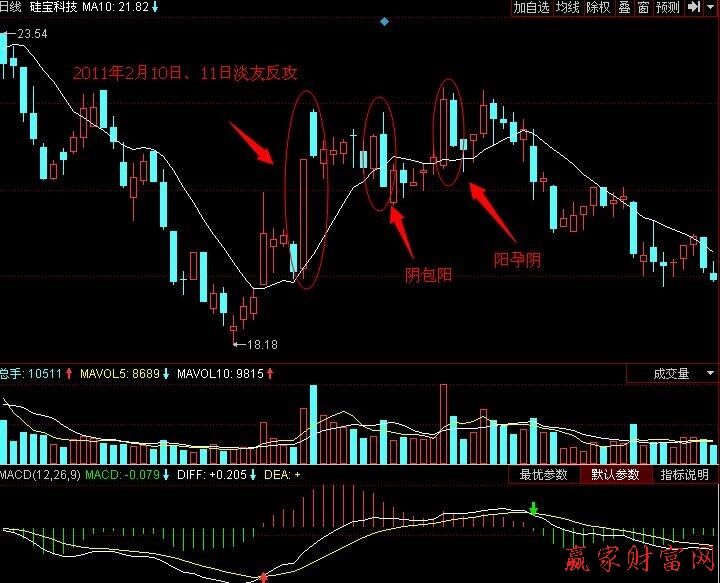 如圖所示,2011年2月10日、11日,硅寶科技(300019)的日K線田上出硯了淡友反攻形態。