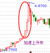 長跑運動員在最后50米或100米總會有一個加速的沖刺,股市中也有類似的情況。如果說股價的上升過程是一個長跑的話,那么頂峰便是終點。當股價快要抵達頂峰時,上漲的幅度就會越來越大,就像運動員在比賽的最后階段加快了步伐一樣,所以在股價走勢圖上就會出現加速上升形形態。