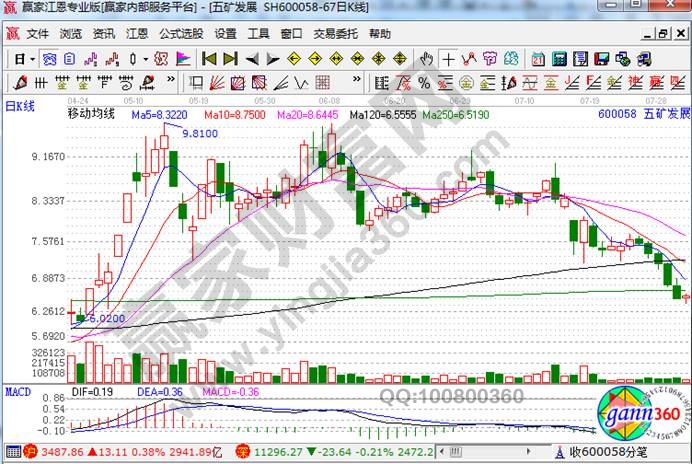 五礦發展在2006年6月13日前后的走勢圖中,我們可以看到股價從6月初連續走高之后,在6月13日摸高至9元,上方之后便形成“城下霜月”譜圖形,股價一路下行至8月7日的6.31元方才止住。跌幅達40%左右。